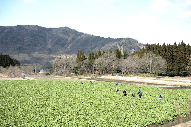 今日は少し肌寒いけれど、お隣の畑では高菜の摘み取りです。